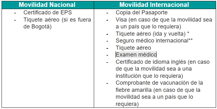 Nota: En este caso, los interesados deberán gestionar por cuenta propia el traslado a la universidad de destino, tiquetes, alojamiento, seguro médico internacional (para los estudiantes que realicen movilidad internacional) y visa (si aplica).