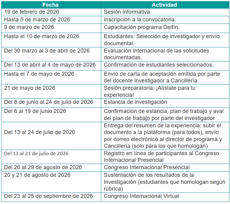 2. Una vez cerrada la convocatoria y analizados los candidatos, la Cancillería citará a los estudiantes que cumplan con los requisitos de la convocatoria a un taller preparatorio sobre el Programa Delfín (9 de marzo).
