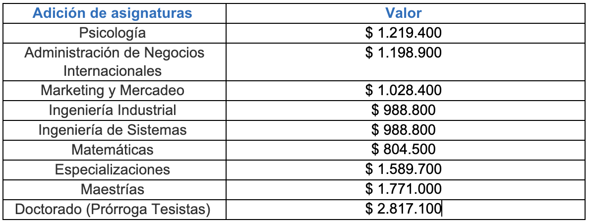 Nota: Para free movers no aplican los alivios financieros del –10% y –5%. Los valores de cada asignatura están reglamentados por el Consejo Superior.
